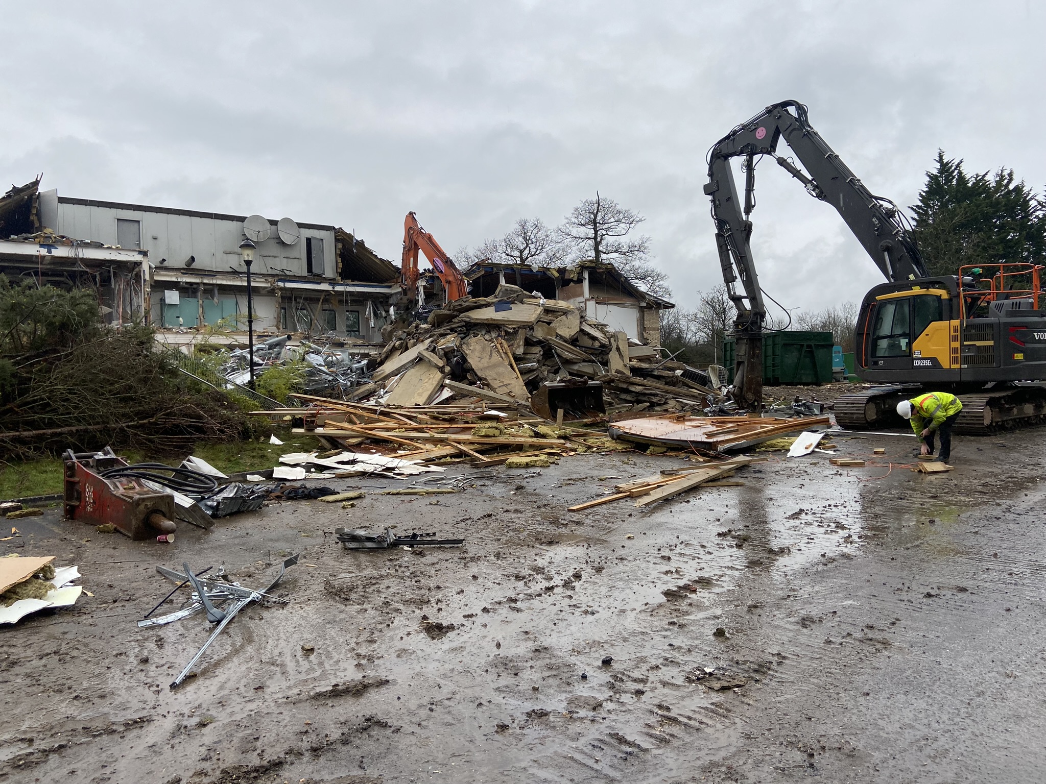 Following a small, controlled removal of notifiable asbestos-containing materials (ACMs), we began the strip-out phase. This stage involved the removal of all internal fixtures, fittings, and non-structural elements to prepare the building for heavy demolition. Using a mid-reach excavator with a selector grapple attachment, we systematically dismantled the building from top to bottom. The phased approach allowed us to carefully remove the timber roof, reduce the walls, and finally, remove the floor slabs while keeping the site safe and organised.