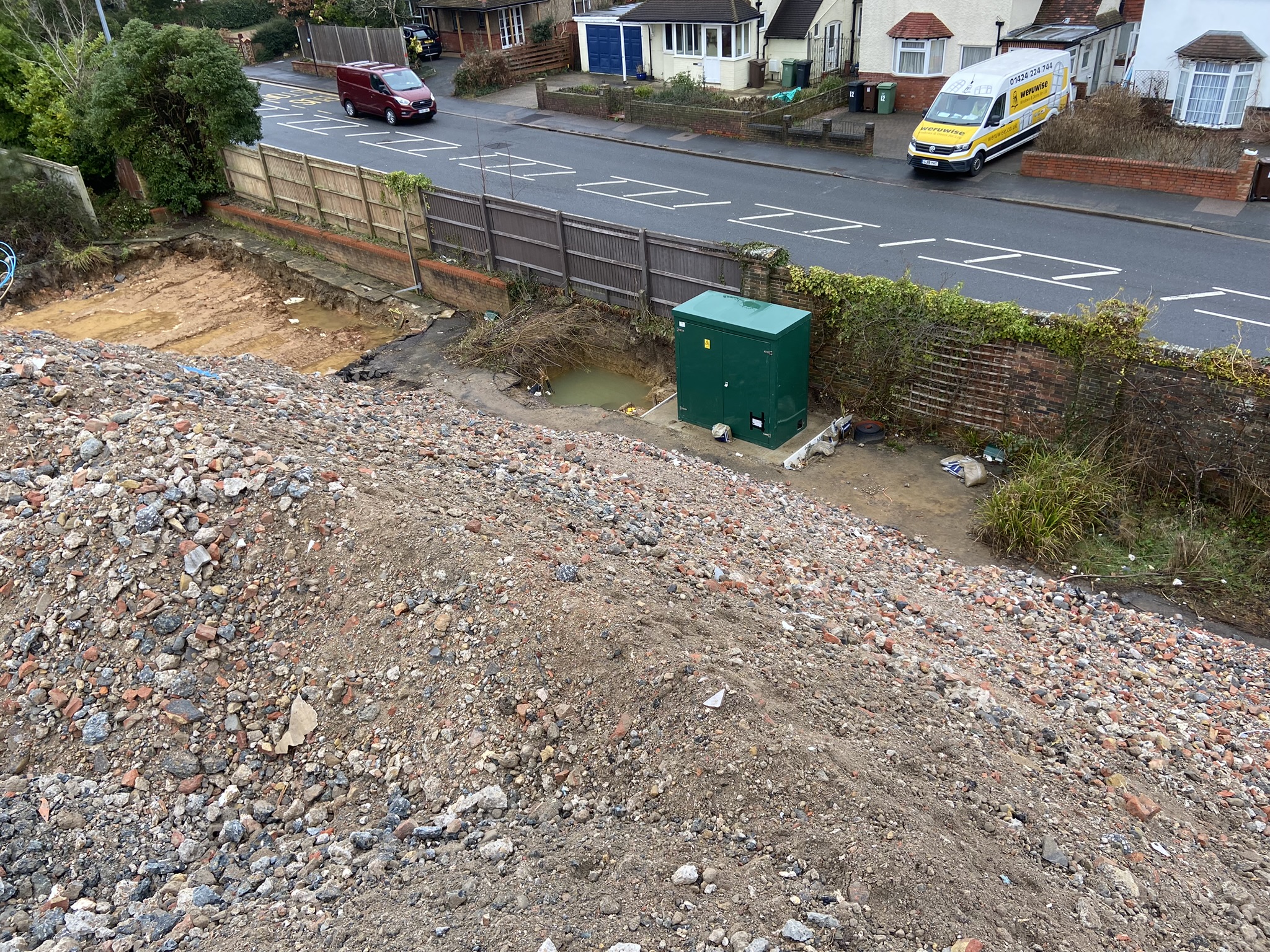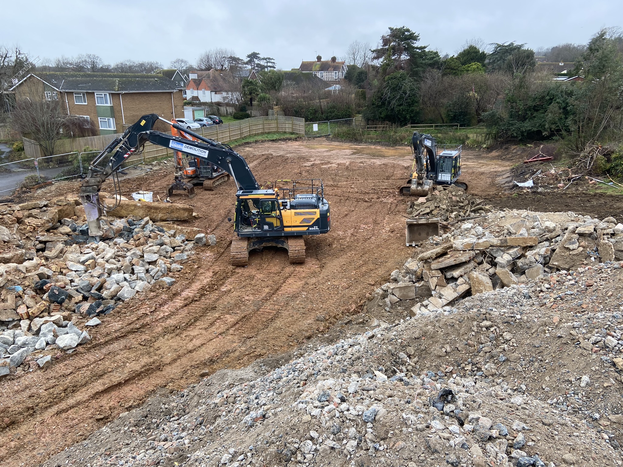 LNT Construction recently acquired an aging 100-bedroom nursing home with plans to redevelop the site into a state-of-the-art, purpose-built nursing facility. The existing building was outdated and no longer suitable for its intended purpose, requiring full demolition to prepare for the new construction. Our team was contracted to demolish and clear the site, crush all appropriate materials on-site, and stockpile them in a designated area for future use. The project site was strategically located just off the main A259 road in a residential area, bordered by a Grade II-listed cottage on one side and a secured facility on the other. A significant aspect of the project was maintaining uninterrupted, 24/7 access to the secure facility, as it shared an access route with our demolition site.